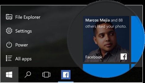 Zo kan de Facebook-app meldingen tonen op de desktop, en kunnen statusupdates getoond worden in de live-tegels van het startmenu. Hetzelfde geldt voor berichtendienst Messenger.