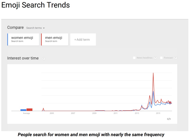 Het voorstel komt niet alleen vanuit een persoonlijke behoefte, maar Google heeft gemerkt dat er bijna evenveel naar vrouwelijke emoij’s gezocht wordt gezocht als naar mannelijke smileys.