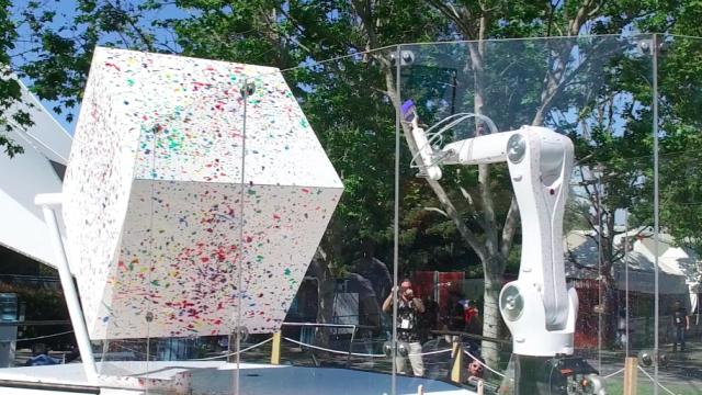 Wanneer de smartphone vervolgens door de lucht wordt gezwaaid, doet de robot hetzelfde en wordt er verf op een grote witte kubus gespat, onder begeleiding van een funky muziekje.